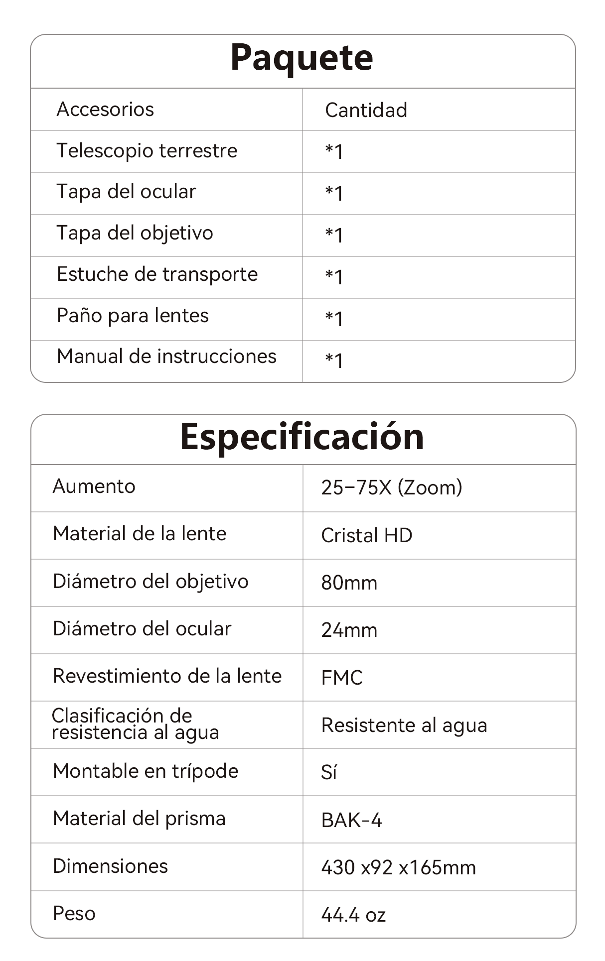 - Zoom Continuo 25–75× – Ajusta fácilmente el aumento según la distancia de observación.